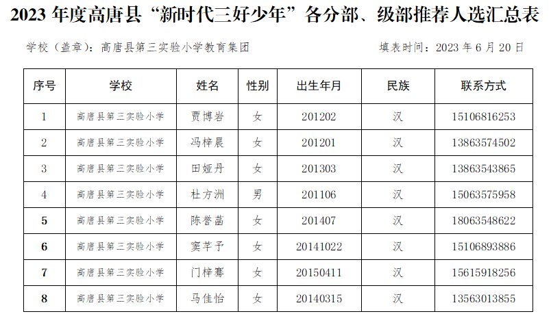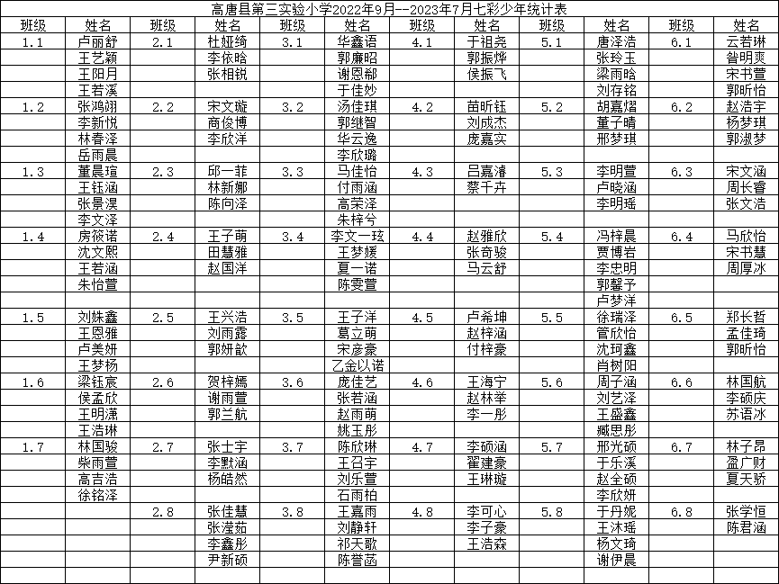 附件一:高唐县第三实验小学2022.9--2023.7七彩少年统计表